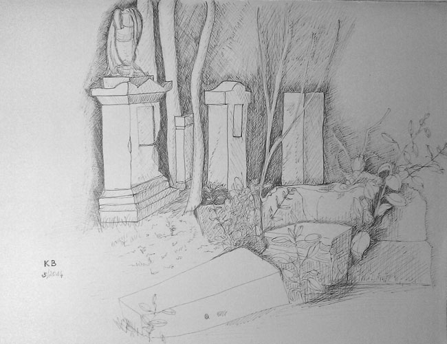 Heute war das gemeinsame Zeichnen am Friedhof St. Marx, einem wunderschönen aufgelassenen Biedermeier-Friedhof. Ich hab mich dort fast wie an einem verwunschenen Ort aus dem Märchen gefühlt – wäre da nicht die A23 mit dem Autolärm, die einen im Hier und Heute hält…