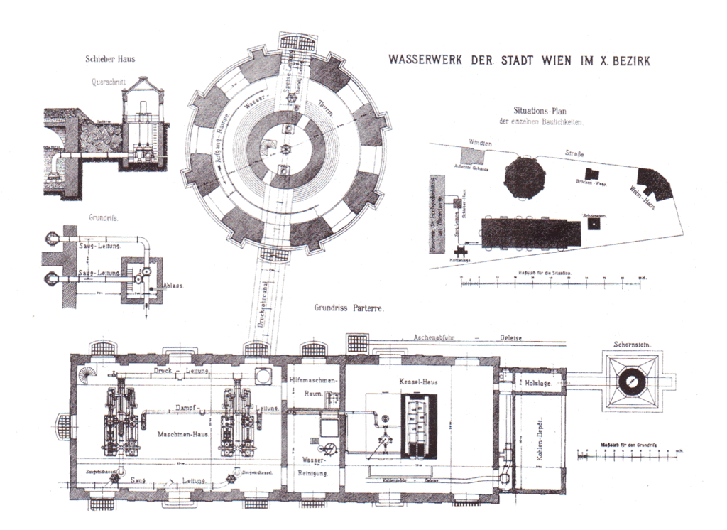 Grundrissplan: Beschreibung: Plan der Anlage des Wasserturms in Favoriten mit Maschinenhaus / Quelle: Stadt Wien, MA 31 Wiener Wasserwerke / Urheber bzw. Nutzungsrechtinhaber: Stadtbauamt Wien, Franz Borkowitz / Datum vor 1898 / Genehmigung: gemeinfrei