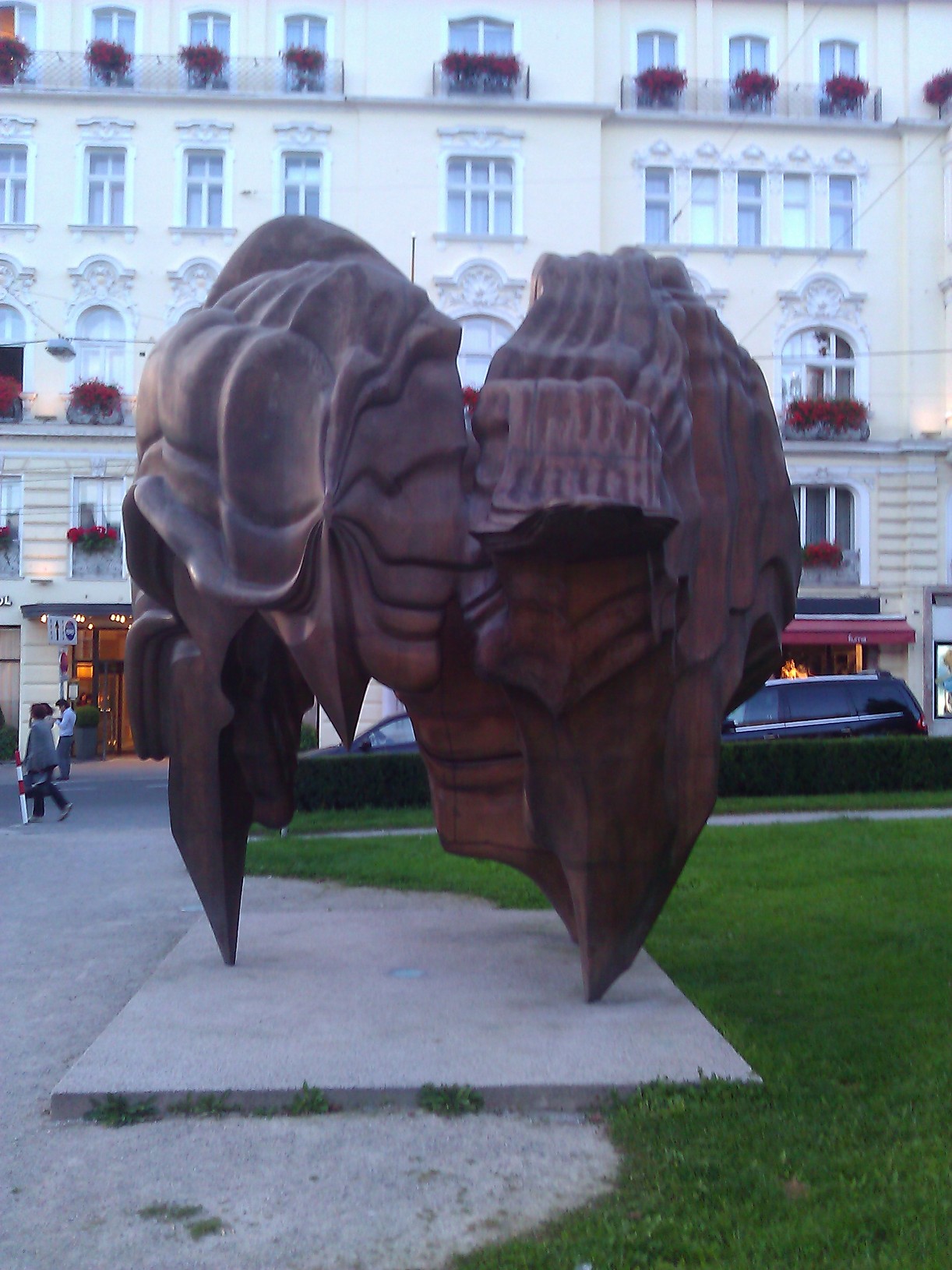 Ich finde den Gegensatz zwischen der riesigen Bronzeskulptur (ca. 5m hoch) und den historischen Häusern auf diesem Platz spannend, aber vor allem die futuristischen, an Aliens erinnernden organischen Formen an sich gefallen mir sehr gut.