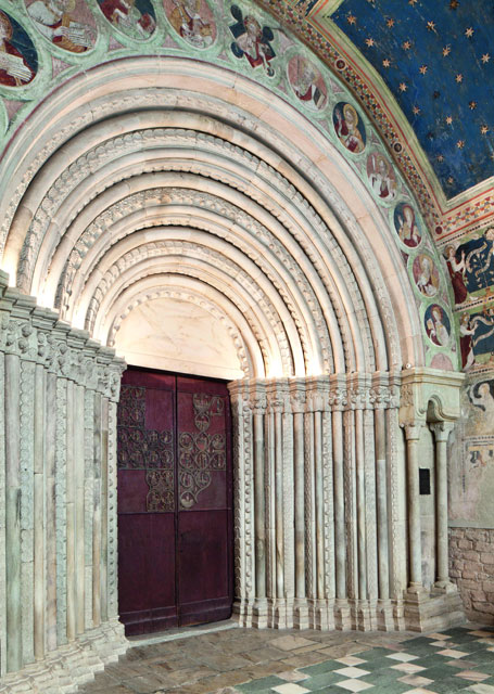links: Gesamtaufnahme der polychromen Holzreliefs am Westportal des Domes zu Gurk. © BDA, Foto: Irene Dworak rechts: Das romanische Westportal des Domes zu Gurk. © BDA, Foto: Irene Dworak