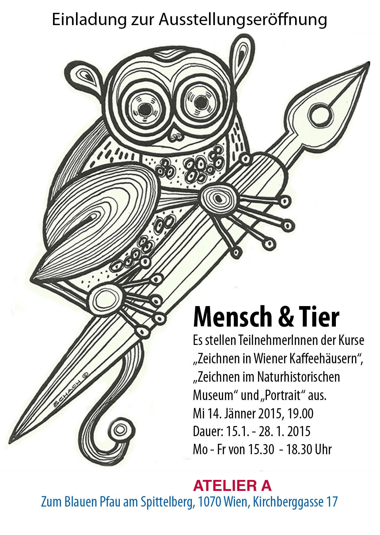 Am Mittwoch den 14.01.2015 um 19:00 eröffnet die Ausstellung „Mensch & Tier“, im Atelier A Zum Blauen Pfau am Spittelberg, Kirchberggasse 17, 1070 Wien.