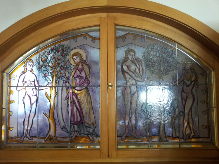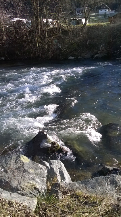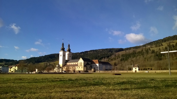 Schlußpunkt des Tages nach einem Spaziergang entlang der Gurk waren ausgezeichnete Kärntner Nudeln im Gasthof Erian (nicht der Gasthof direkt beim Dom, sondern eine Straße weiter nach Westen), das Aufwärmen nach 2 Stunden eiskaltem Dom war bei sehr nettem und persönlichem Service doppelt angenehm und eine besondere Überraschung war, daß in der Gaststube neben dem Kachelofen ein Fenster mit Glasmalerei Motive von den Fresken in der äußeren Vorhalle (Adam und Eva) wiederholt!
