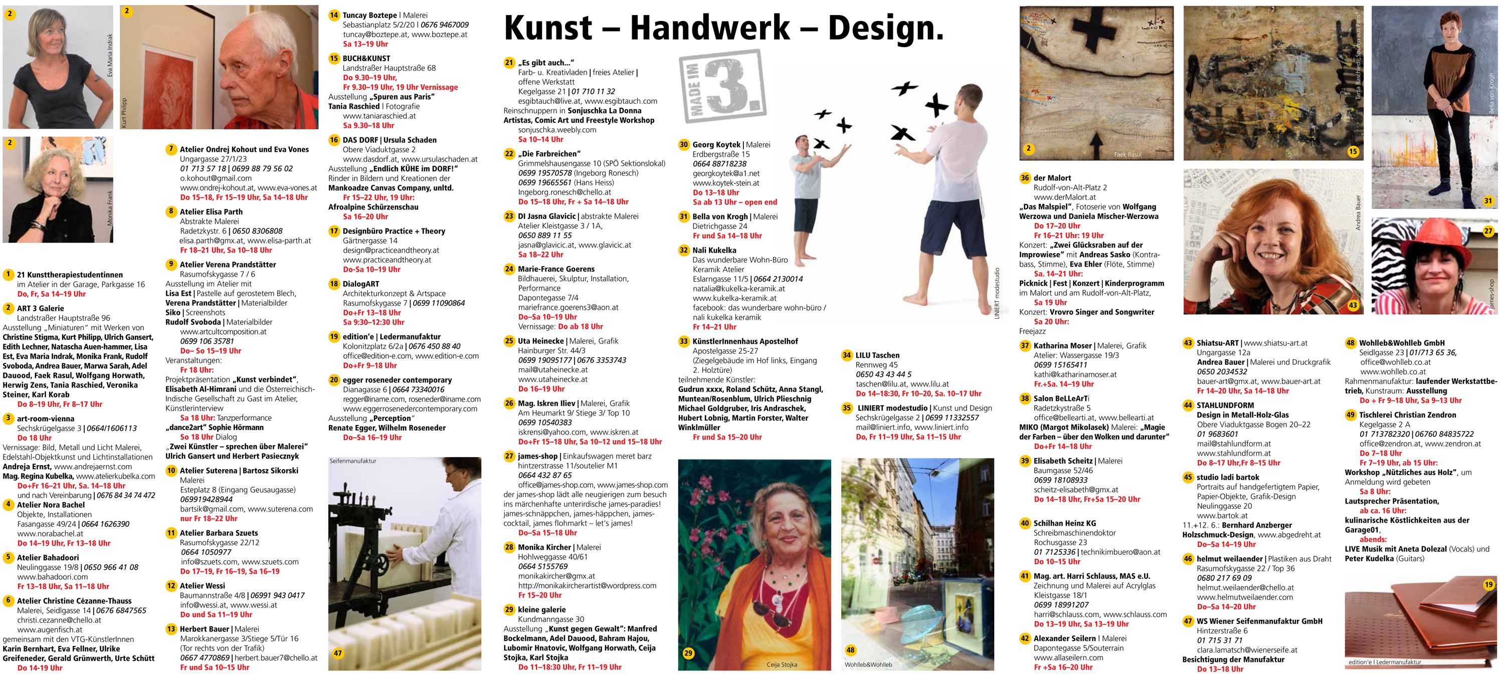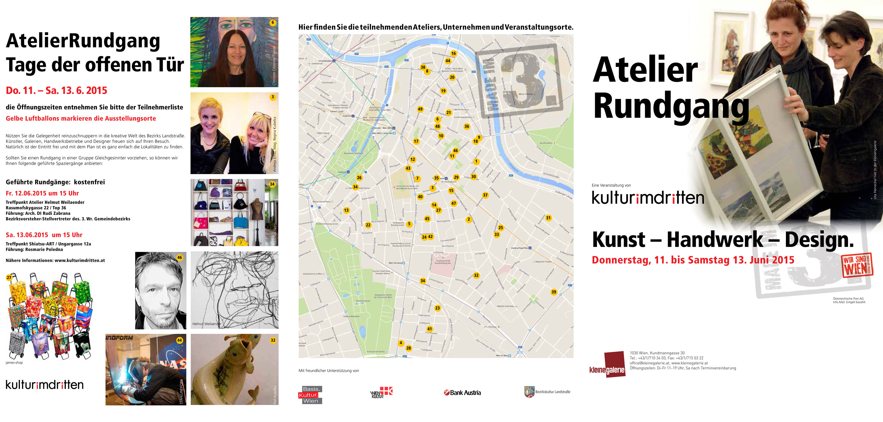 Vom 11. bis 13. Juni 2015 findet in Wien der AtelierRundgang bzw. die Tage der offenen Tür „Made im 3. Kunst – Handwerk – Design“ statt, ich würde mich freuen den einen oder die andere an einem dieser Tage bei der Ausstellung der „Farbreichen“ in der Grimmelshausengasse 10 begrüßen zu können.