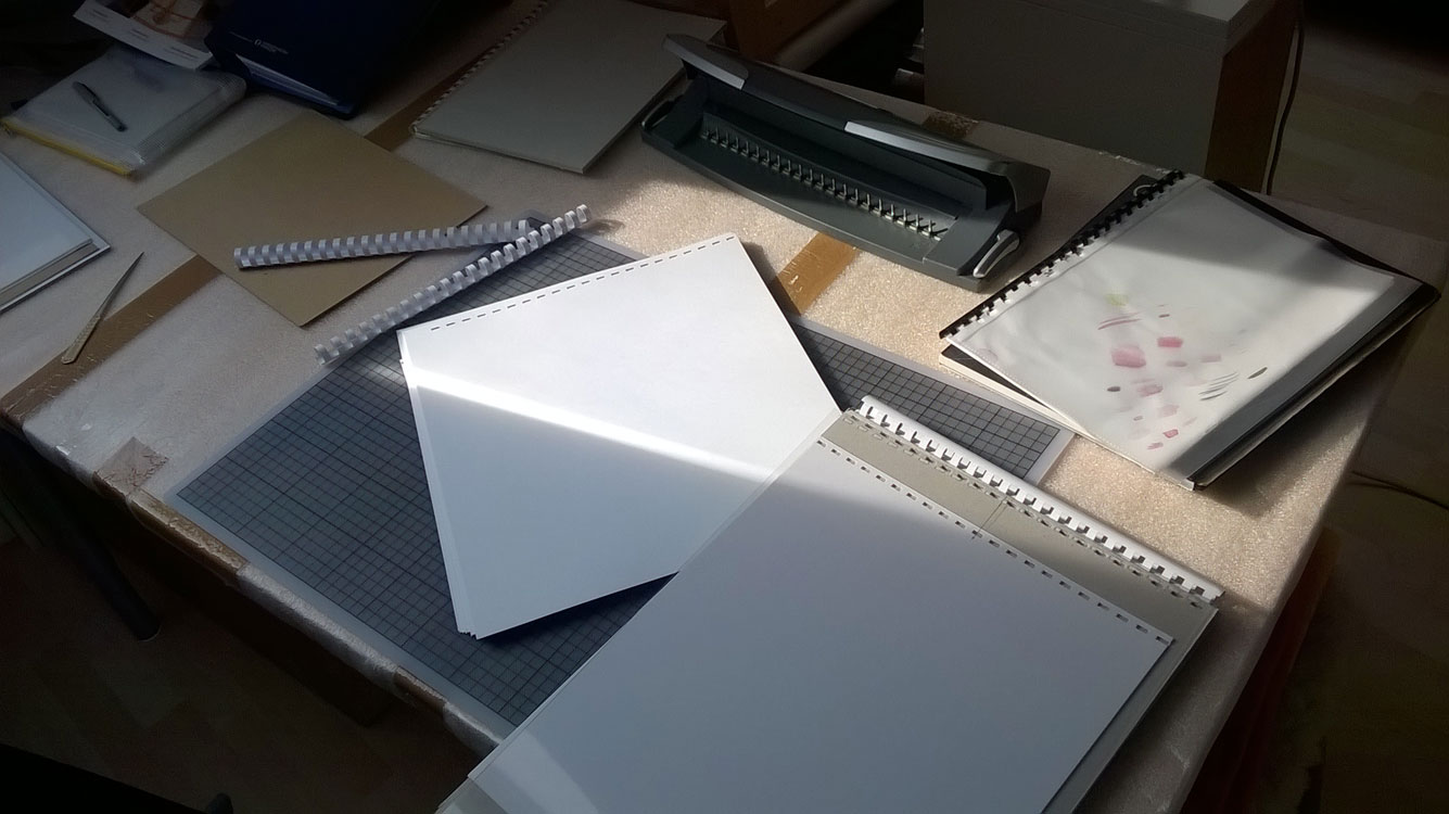 Nachdem mich die losen Blätter im Freien, vor allem bei Wind oder Nieselregen, eher zur Verzweiflung bringen (ich brauche meine Ordnung und saubere unzerknitterte Blätter, ja, ich stehe dazu, ein bißchen Monk zu sein… 😉 ) und ich zusätzlich eine Spiralbindemaschine als längerfristige Leihgabe erhalten habe, hat das Vergnügen seinen Lauf genommen!