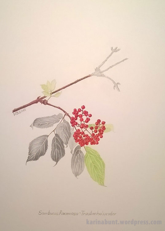 Hier die fertiggestellte Zeichnung meines Traubenholunders (begonnen im Beitrag: Botanische Zeichnung), die fehlenden Teile habe ich anhand der beim Kurs von der Pflanze angefertigten Fotos vorsichtig mit Bleistiften ergänzt.