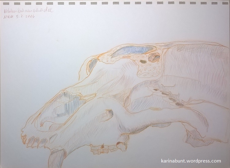 Obwohl das Museum in den letzten Jahren viele Säle modernisiert und neu gestaltet hat, hat es teilweise noch immer das gemütliche Flair von einst behalten und auch Zeichner werden meist toleriert bzw. ignoriert – also konnte ich in aller Ruhe den Höhlenbärenschädel skizzieren.