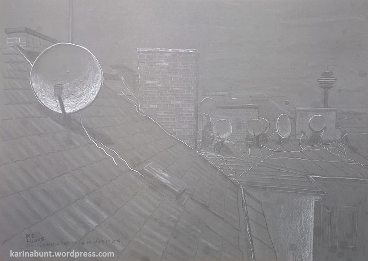 Blick aus dem Fenster im 10. Wiener Bezirk: zahlreich montierte und äußerst kreativ verkabelte Satellitenschüsseln, wohin man auch blickt… 🙂