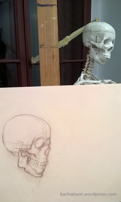 Schädelstudie – Vorzeichnung mit Kreide auf grundierter HF-Platte 30x40cm (März 2016)