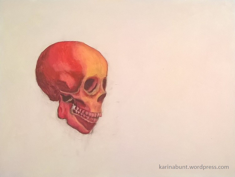 Ich habe mir zum besseren Verständnis der Formen für die „Unterkonstruktion“ künftiger Portraits einen Schädel genauer angesehen und nachdem mir schwarz/weiß ein bißchen konventionell erschienen ist diesmal in rot/gelb.