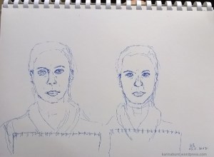 Ich hab mir glaube ich pro Versuch ca. 3min gegönnt, besonders ähnlich sehen sie mir nicht. Was man aber gut sieht, ist die dafür notwendige Anstrengung – stehend, in einer Hand den Block und in der anderen den Stift, und das immer noch im Zustand des Grippevirus-Bekämpfens, in dem schon das Teekochen in die Kategorie „schweißtreibende Anstrengung“ fällt 🙂