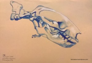 Heute gleich eine Zeichnung aus dem NHM, regenbedingt war heute Plan B dran: Der Schädel eines Riesenfaultiers; mit Tintenroller und weißem Gelstift auf glattem Tonpapier, 25x35cm, gezeichnet.