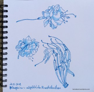 Ein paar wenige Skizzen von abgebrochenen Pelargonienblüten und verblühten Rhododendronblüten hab ich trotzdem gezeichnet. Nachdem das Papier zu dünn für Wasser ist, habe ich meinen Uniball Eye Micro nicht mit dem Wasserpinsel bearbeitet sondern mit blauem Farbstift kombiniert – auch ein netter Effekt.