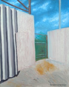 Angefangenes Bild eines Seitenausgangs des mit Sickenblech umzäunten Fußballplatzes in der Kennergasse.