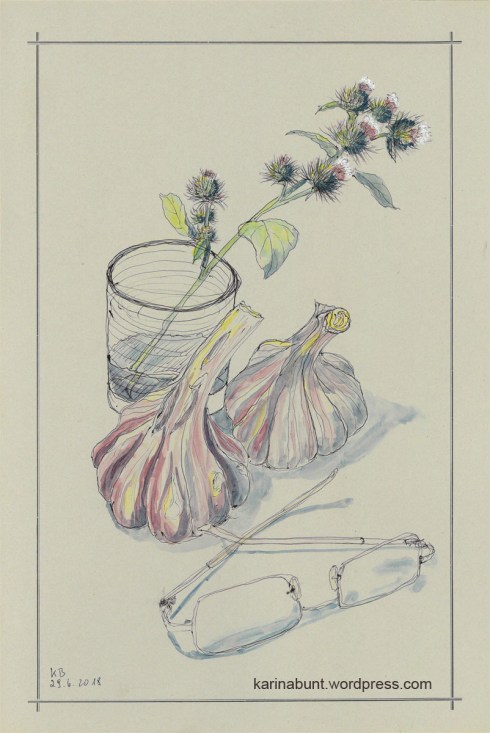 Stilleben mit Disteln von einem Spaziergang (Gstettn unter der A23) und zwei Knoblauchknollen vom Viktor-Adler-Markt, also mit ein bißchen Phantasie auch Favoriten 🙂 zähle ich aber jetzt nicht im Ernst zu meinem Projekt, sondern war einfach ein netter Zeitvertreib.