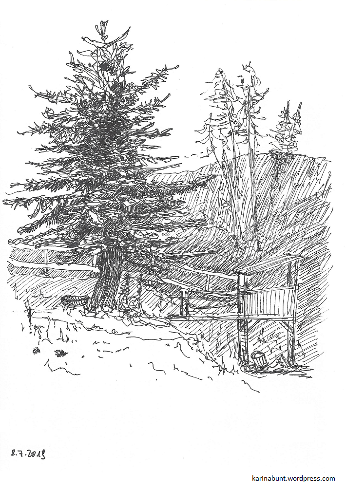 Heute eine Skizze aus dem Sommer 2019, aus der Malwoche in der Steiermark (juhu, heuer gibt es wieder eine!) Die Fichte in der Mitte der Wiese vor dem Haus, in dem wir gewohnt bzw. um das herum wie gemalt haben (hier zwei der Ergebnisse dieser Woche, die ich schon veröffentlicht habe: Steirische Berge und noch mehr steirische Berge)