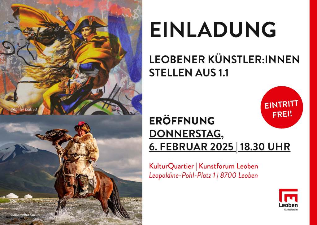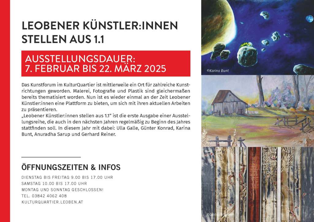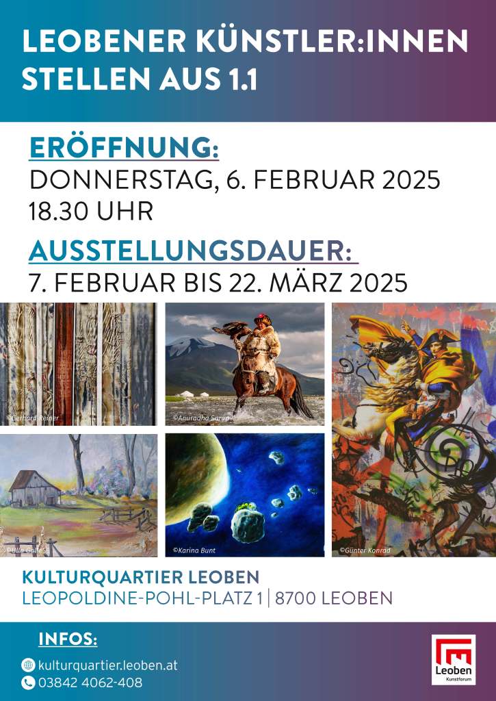 Am 06. Februar 2025 um 18:30 wird die Gruppenausstellung „Leobener Künstler:innen stellen aus 1.1“ im KulturQuartier Leoben, Leopoldine-Pohl-Platz 1, 8700 Leoben eröffnet, bei der ich meine Serie „Pentaptychon multiple Morgen, Teil 1-5“ beisteuere.