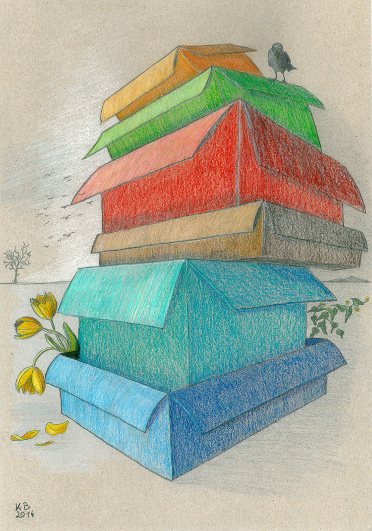Vorheriges Bild Nächstes Bild Schachteln-kor_verkleinert Bleistifte und Farbstifte auf Tonpapier, 30x42cm