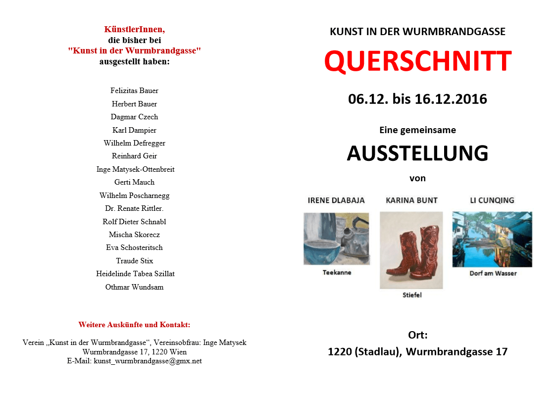 Eine gemeinsame Ausstellung von Irene Dlabaja, Li Cunqing und Karina Bunt, wir zeigen in unserer gemeinsamen Ausstellung eine Querschnitt gegenständlicher Malerei. Die Vernissage findet am Dienstag, den 06.12. 2016, um 19 Uhr statt. Weitere Öffnungstermine der Ausstellung, die mit einer Finissage am Freitag 16.12. von 17:00 bis 19:00 Uhr endet, sind am Freitag, 09.12. bis“Kunst„Kunst in der Wurmbrandgasse“ weiterlesen