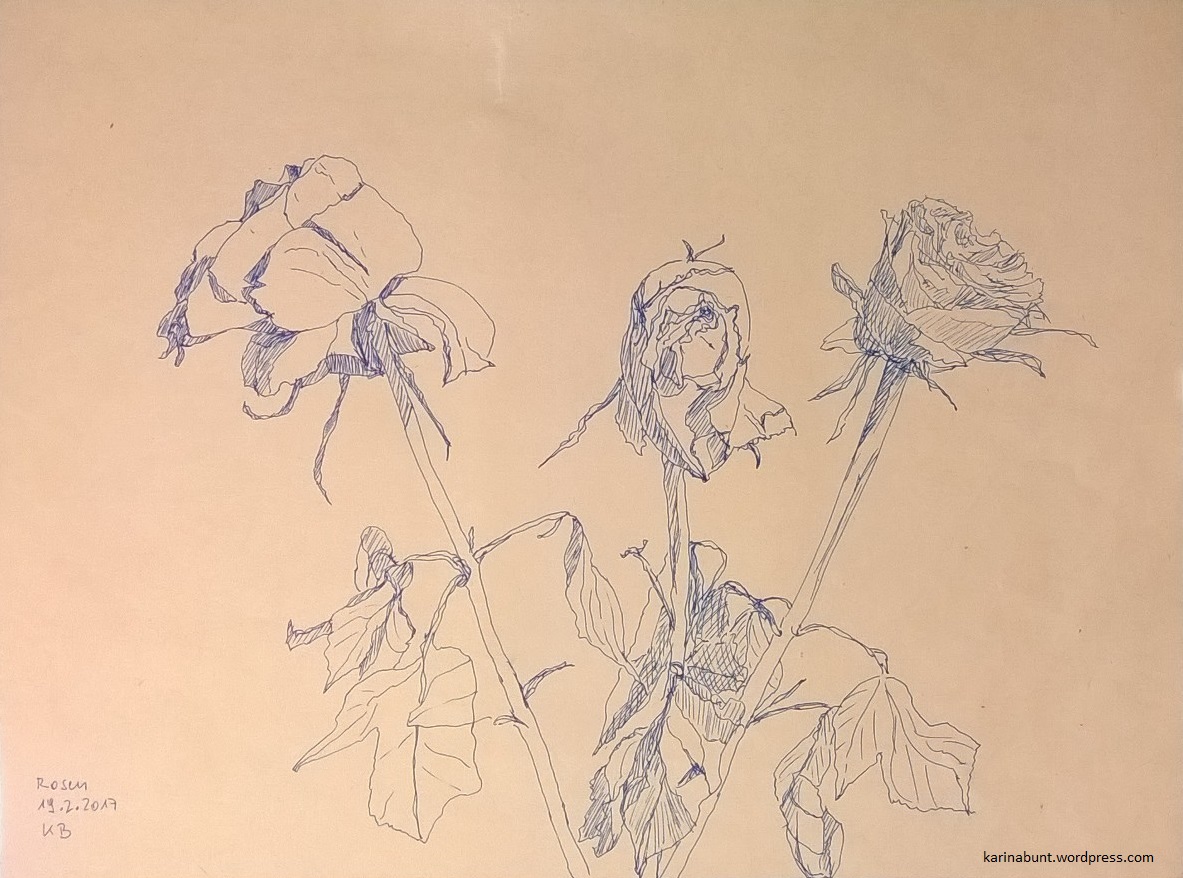 Virenbedingt fällt derzeit leider nicht nur das Morgenmalen im Freien, sondern auch jede sonstige Aktivität aus – daher nur kurz eine Zeichnung aus dem Februar, die ich sehr mag: vertrocknete Rosen mit Tintenroller auf Tonpapier. Grippeähnliche Zustände im Sommer sind noch widerlicher als im Winter, ich sags Euch! Vor allem kostet es mich die morgige Portraitsession,“Rosen„Rosen & Ausstellung in der Steiermark“ weiterlesen