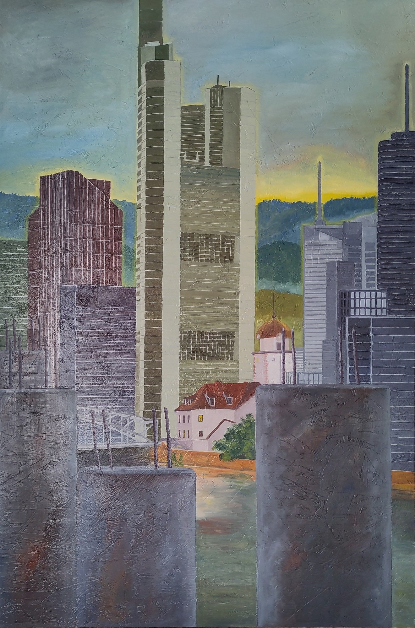 Die Serie „Pentaptychon multiple Morgen“ beschäftigt sich mit der (In)Stabilität der Welt und zeigt unterschiedliche Zukunftsvisionen, die auf immer derselben Ansicht der Stadt Leoben basieren. Die Bilder thematisieren realistische Entwicklungen wie Klimawandel und geopolitische Spannungen und laden dazu ein, den Raum zwischen Utopie und Dystopie aktiv zu gestalten.