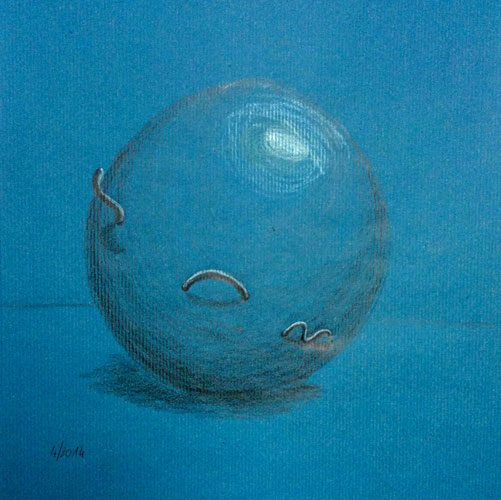Vorheriges Bild Nächstes Bild Wurm_drin_04-2014 Farb- und Aquarellstifte auf blauem Packpapier, 30x42cm